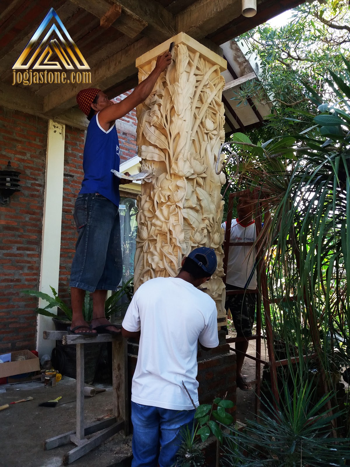 Hiasan untuk tiang rumah terbuat dari bahan dasar batu alam paras jogja di kerjakan secara tradisional dengan mengandalkan alat pahat sederhana.